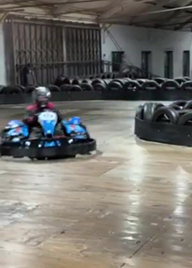 three go-karts racing on an indoor track