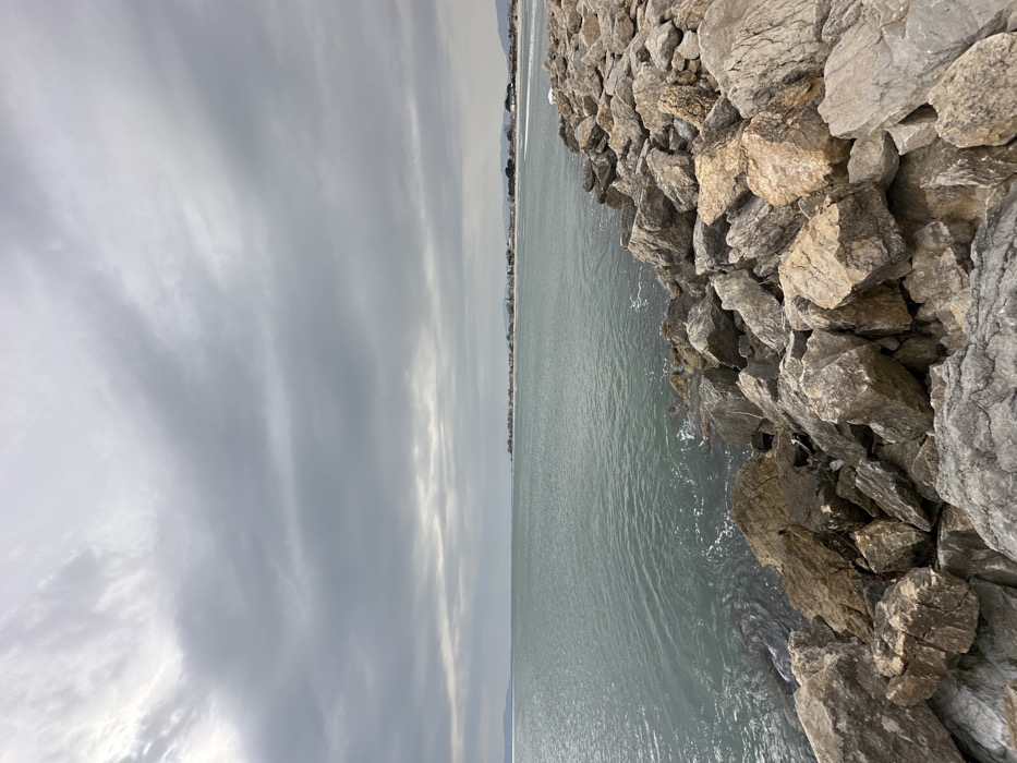 This image depicts a coastal scene in Limenas Avdiron, Greece, under an overcast sky. The foreground and right side are dominated by a rocky breakwater or natural shoreline composed of large, irregularly shaped boulders in varying shades of grey, brown, and tan. The rocks meet the calm, greenish-blue sea, which occupies the midground and left portion of the image. Small whitecaps are visible where the water meets the rocks. In the distant background, along the horizon, a low-lying coastline features what appears to be a small coastal settlement or town, marked by visible buildings and structures. Further inland, faint outlines of hills or mountains are discernible. The sky is entirely covered with thick, grey clouds, indicating overcast weather conditions. No individuals, animals, or specific objects indicating human activity (beyond the distant settlement) are present in the immediate scene.