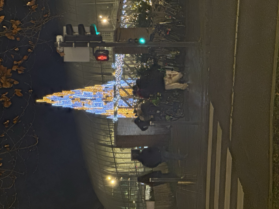 Night scene featuring a brightly lit Christmas tree of blue and gold lights. People stand near the tree on a sidewalk lined with parked bicycles. A traffic light shows a green light for pedestrians. A crosswalk marks the street to the right. In the background, a large building with a curved roof is visible. Bare tree branches frame the left edge of the image.