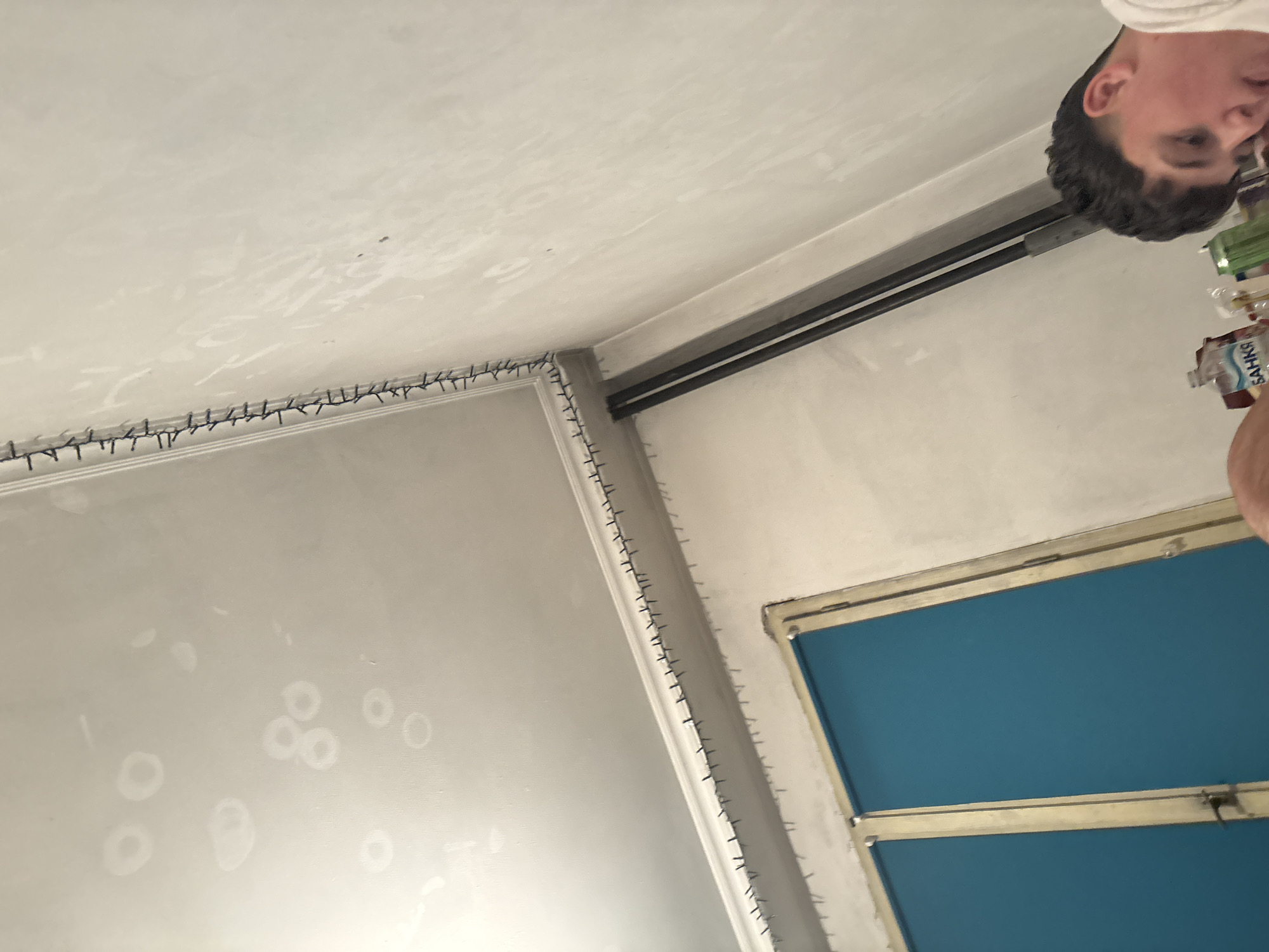 room's interior, likely taken at an upward angle. Walls are painted a light grey with some circular smudges present. A string of small lights is affixed along the upper edges of some walls. A blue and tan door or window frame is visible in the lower right. Two horizontal dark pipes run along the top of the wall. A man's face is partially visible in the upper right corner. There is an open package of water bottles in the background. There is no indication that the photo was taken in the city of Montana, Bulgaria.