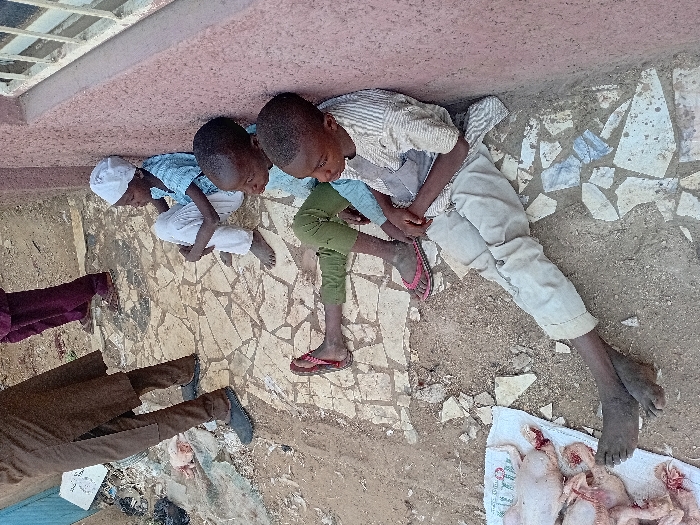 An outdoor scene in Sharada, Nigeria, features three young males seated on a dirt and broken tile surface. The boy in the foreground wears a striped long-sleeved shirt and light beige trousers, his bare feet extended, leaning against a reddish-brown stucco wall. To his left, a second boy wears a light blue top, green trousers, and pink flip-flops. A third boy, further back, wears a light blue top, white trousers, and a white cap, sitting with his knees drawn up. All three are positioned in various states of repose. To the immediate left of the seated individuals, several pieces of raw, plucked poultry, displaying visible blood, are arranged on white material directly on the ground. In the background, the lower legs of two adults are partially visible; one in brown trousers and dark shoes, and another in purple trousers and sandals. The reddish-brown wall behind the boys includes a partial view of a white-barred window in the upper right. The ground throughout the scene is uneven and contains general debris, including dark plastic bags.