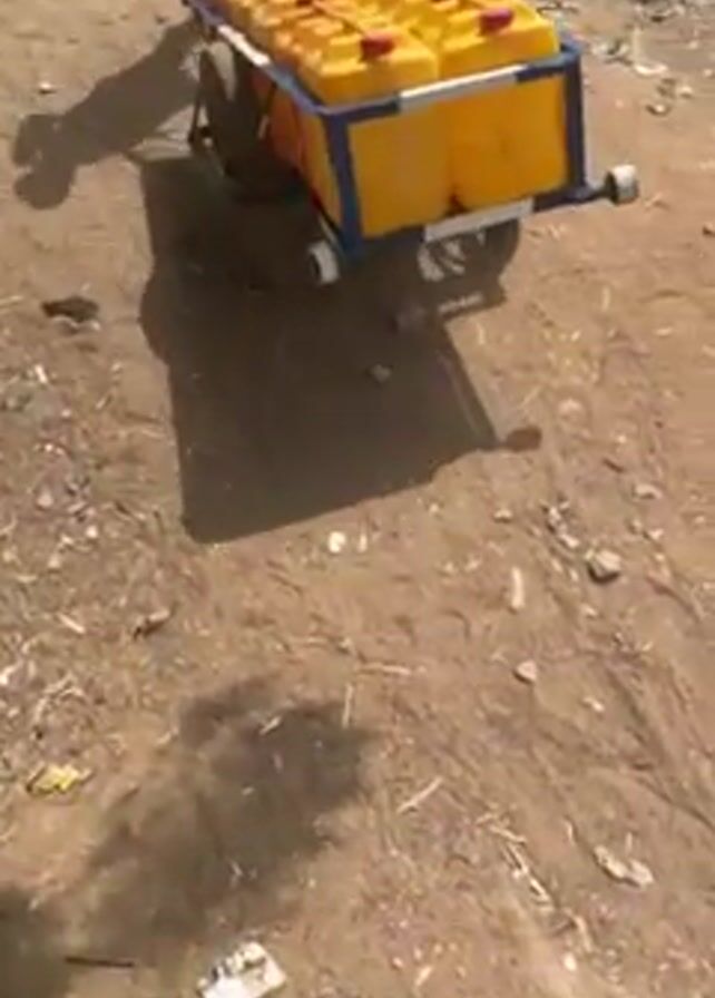 - "A man is seen pushing a two-wheeled cart loaded with numerous yellow plastic containers along a dirt path" by FM-cakwC2, licensed under CC BY 4.0