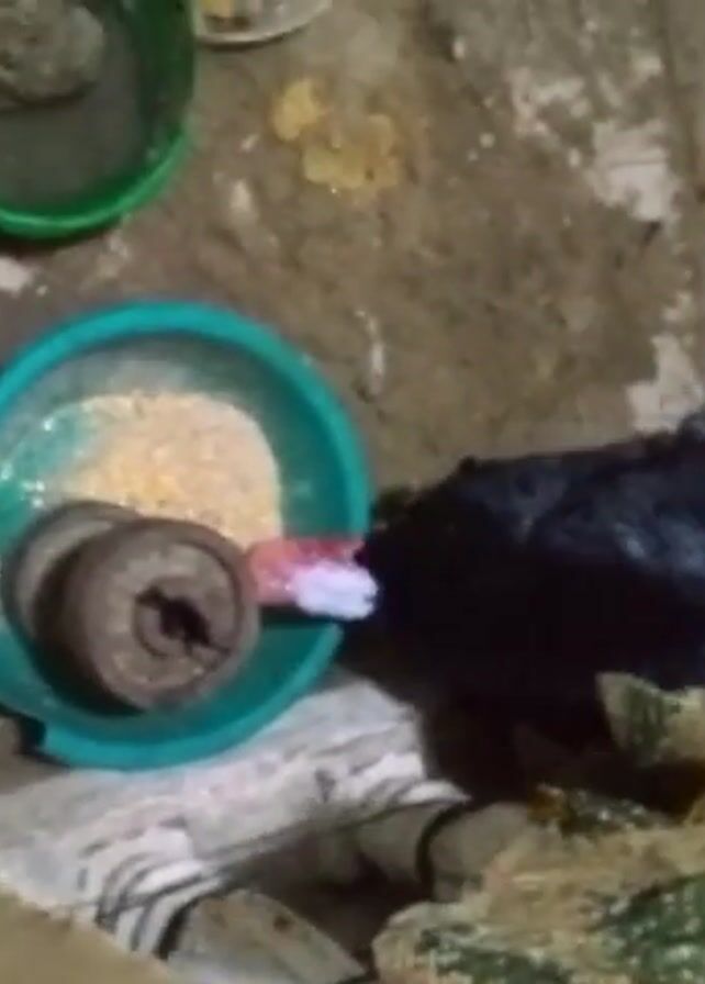 A black turkey eats from a green plastic bowl filled with corn. A rusty metal weight rests inside the bowl. Another green bowl and a patterned cloth are also visible on the floor. The surrounding area appears dirty and unkempt.
