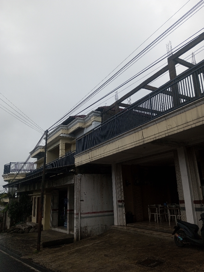 The image displays a street scene in Babaliya Mal., India, under an overcast sky. A multi-story building dominates the frame, featuring yellow-painted upper floors with white architectural trim and red-tiled roofing. Multiple balconies with dark, vertically-slatted metal railings extend along the building's facade. The uppermost right section of the structure exhibits exposed concrete beams and rebar, indicating incomplete construction. The ground floor varies; a small, dark shopfront with a metal awning is visible on the left, an unpainted concrete wall with horizontal red and grey stripes occupies the center, and a recessed, open area on the right reveals several light-colored tables and chairs within a darkened interior, possibly a commercial establishment. A dark-colored scooter or motorcycle is partially visible parked on the right side of the ground level. A utility pole stands on the left, supporting numerous overhead power or communication lines that crisscross the sky. The ground surface in the foreground appears damp. No individuals are present.