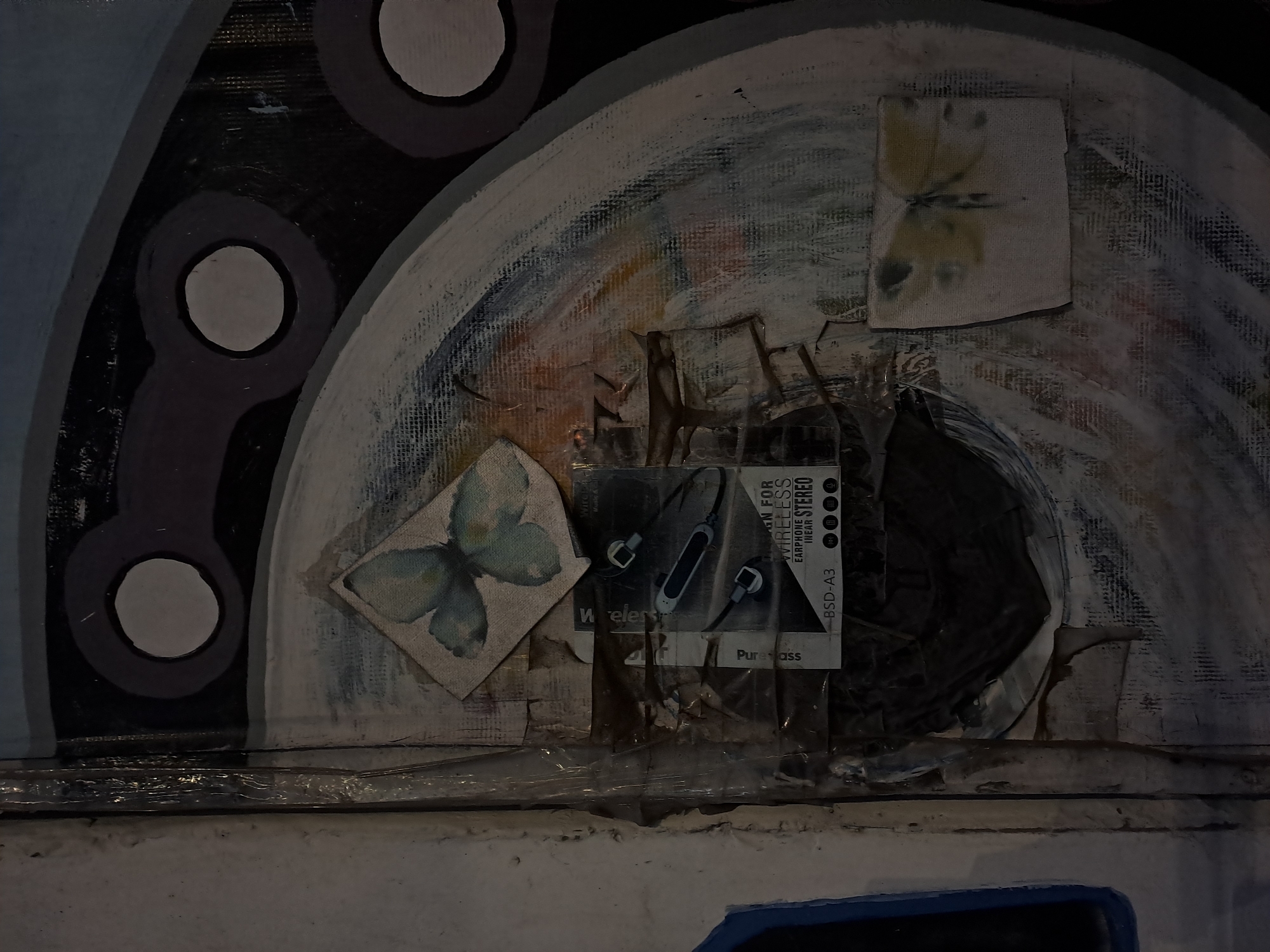 A close-up image depicts a layered, textured surface, likely a wall or panel. The background features abstract painted elements: a large, curving sweep of white and light grey paint, showing visible brushstrokes and underlying hints of blue, orange, and dark grey. In the upper right, a dark grey/black area contains two prominent grey circular shapes with dark outlines, resembling interconnected gears or abstract symbols. A vertical strip of white/light grey runs along the left edge, with a narrow blue border visible. Adhered to this painted surface are several objects: 1. A central, rectangular product label, creased and partially obscured, advertises "WIRELESS EARPHONE INEAR STEREO" (model "BSD-A3"), featuring an image of black wireless earbuds. This label is secured by multiple strips of clear, crinkled adhesive tape, some peeling. 2. A smaller, roughly square piece of material, possibly fabric or paper, showing a pale blue butterfly, is adhered above and to the left of the product label. 3. Another similar piece of material, depicting a pale yellow butterfly, is adhered to the lower right of the composition. 4. Various torn fragments of paper and additional adhesive tape are visible, integrating into the layered assemblage. The overall environment suggests an urban setting, possibly a public wall or structure, with the mixed media elements forming a collage or street art piece. The lighting is dim, highlighting textures and shadows. The image provides no specific visual cues or landmarks to identify a precise location within the city of Sofia, Bulgaria.