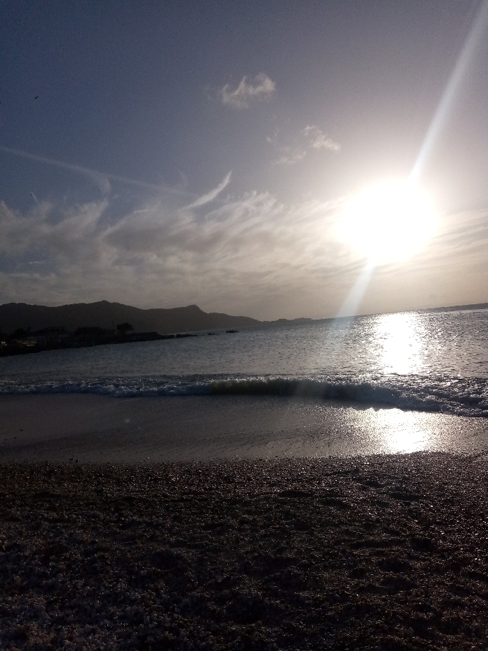 The image presents a coastal scene in Juan Griego, Venezuela, with the sun prominently positioned in the upper right quadrant of the sky. The sky displays a gradient from light blue to a bright, almost white hue near the sun, interspersed with scattered, wispy clouds. The sun emits intense rays, creating a significant glare and a shimmering path of light across the water's surface towards the foreground. The middle ground is occupied by a body of water, where small waves are breaking on the shore, exhibiting white foam. In the distant background, a dark silhouette of hills or mountains stretches across the horizon, with indistinct structures visible along their base near the waterline. The foreground consists of a dark, pebbly beach. The wet sand at the water's edge reflects the sunlight. No individuals, animals, or specific man-made objects are identifiable on the beach or in the water, and no specific actions or interactions are depicted within the frame.