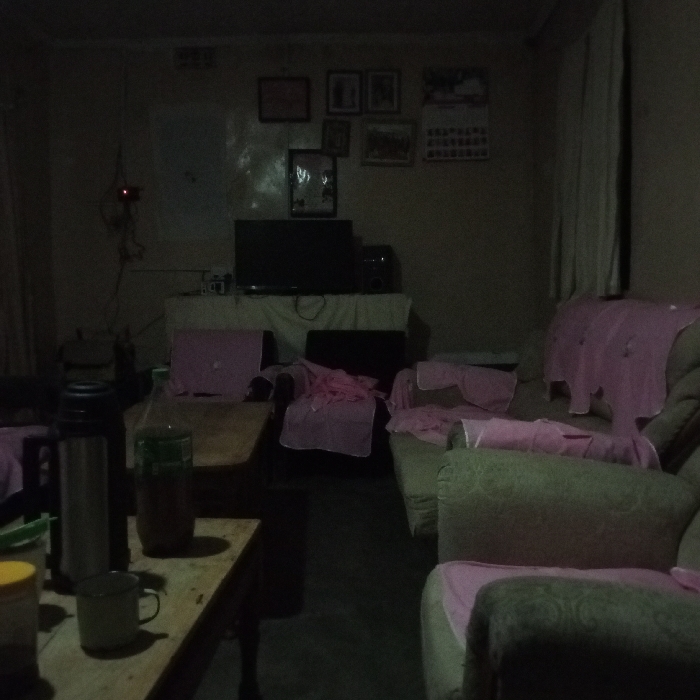 A dimly lit room holds a mix of furniture. A table in the foreground displays a thermos, a bottle with dark liquid, a mug, and a jar. The background reveals a television set atop a white-covered table with various decorative items above. Seating, including sofas and chairs, are draped with pink cloths. The room has a lived-in, cluttered appearance, adding to the sense of a cozy, inhabited space.