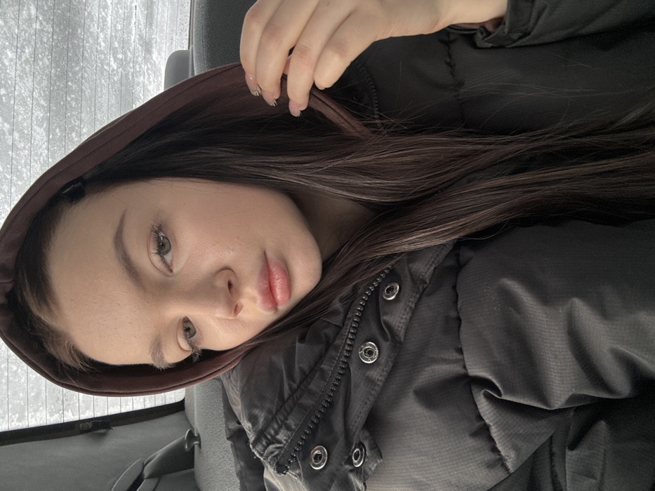 A young female, appearing to be in her early twenties, is depicted in a close-up, chest-up shot, seated within the rear compartment of a vehicle. The scene is located in Severouralsk, Russia. She has light skin, long dark brown hair with lighter strands, and light-colored eyes. Her lips are slightly parted, revealing no teeth, and she has a neutral expression directed at the camera. She wears a dark brown hooded sweatshirt beneath a black or dark grey puffer jacket, which features visible silver snap buttons along the front collar area. Her left hand is raised, with fingers lightly touching the hood near her right temple, revealing manicured fingernails with a light polish. Behind her, a rear vehicle window is visible, heavily obscured by snow or frost, indicating outdoor winter conditions. The vehicle's interior features grey fabric upholstery, and a headrest is partially visible on the left side of the frame.