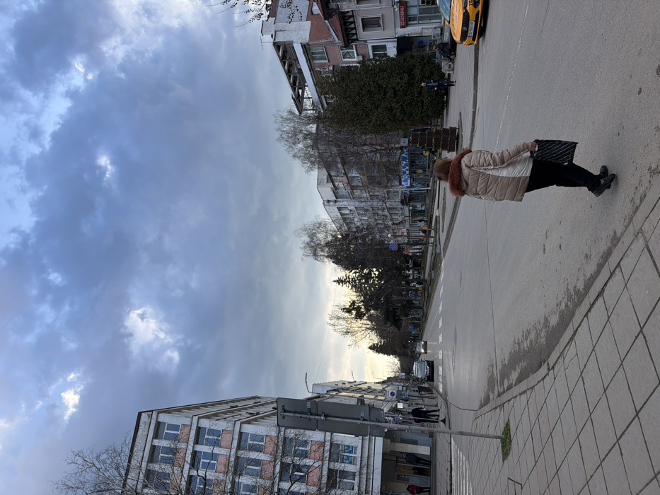 The image depicts an urban street scene in Montana, Bulgaria, under an overcast sky with visible lighter patches of clouds. A female subject, viewed from the back, is positioned in the mid-ground, walking from the right curb onto a paved road, heading towards the left. She is wearing a light-colored puffer jacket with a brown fur collar, dark trousers, and dark shoes, and carries a black and white striped bag in her right hand. The street is a multi-lane thoroughfare with a pedestrian crossing marked on the left. Two vehicles with illuminated headlights are visible further down the road. A yellow taxi with a Bulgarian license plate (M-series) is parked on the right side of the street in the distance. Multi-story buildings line both sides of the street; the building on the left is light-colored with multiple windows and visible balconies. Various other buildings on the right side include commercial establishments on their ground floors, indicated by signage, such as "Generali." The central median of the road contains bare deciduous trees and evergreen conifers, interspersed with planters. Several other pedestrians are present on the tiled sidewalks on both sides of the street, some standing and others appearing to be seated on benches. Streetlights are visible but unilluminated.