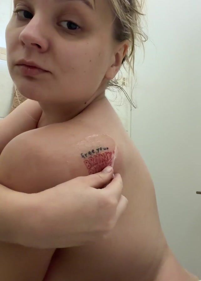 A woman is peeling the clear bandage from a newly inked tattoo on her upper back, near her shoulder. The tattoo says, "Free your Britney, Bitch!" in red and black ink. The woman has fair skin and blonde hair, which is pulled back in a messy style. She is looking at the camera with a neutral expression. The background is a bathroom with white tiled walls, a shower, a towel rack with a brown towel, and a closed white door. Water appears to be running from the shower.
