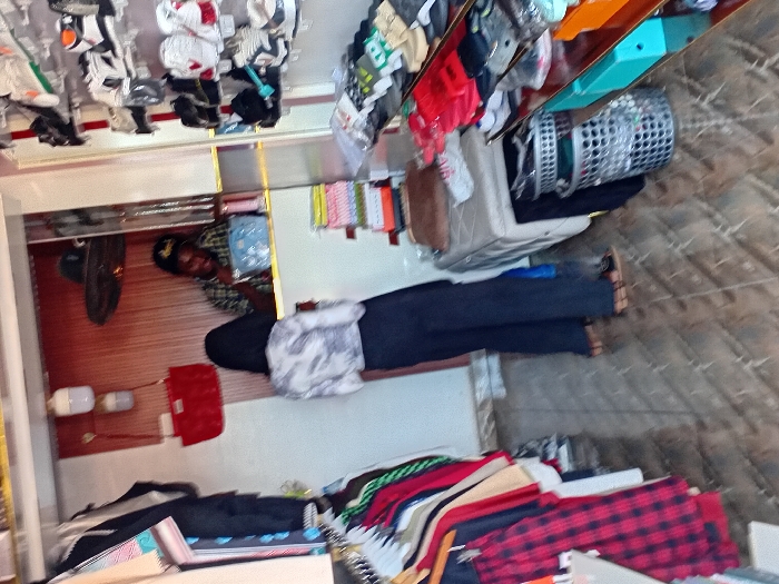 The image displays the interior of a retail shop, likely in Jos, Nigeria, specializing in apparel and footwear