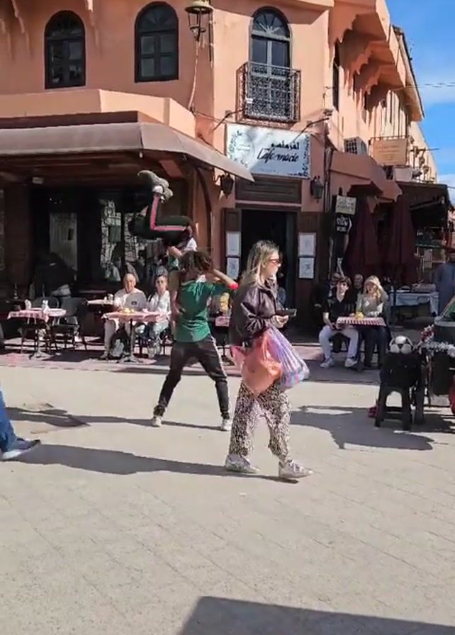 person in a green shirt and black pants supporting another person doing a handstand on their shoulders. The person in the handstand is wearing a black shirt and black pants with a red stripe. The action takes place in a paved public area. In the background is a light orange two-story building with the name "Le Marrakchi" visible on a sign. People are seated at tables outside the building. People are also walking by in the foreground. The sky is visible and is blue. A wheeled cart covered with plastic is in the lower right corner of the shot.