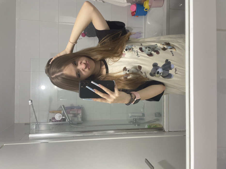 A female individual is depicted in a mirror selfie taken within a residential bathroom
