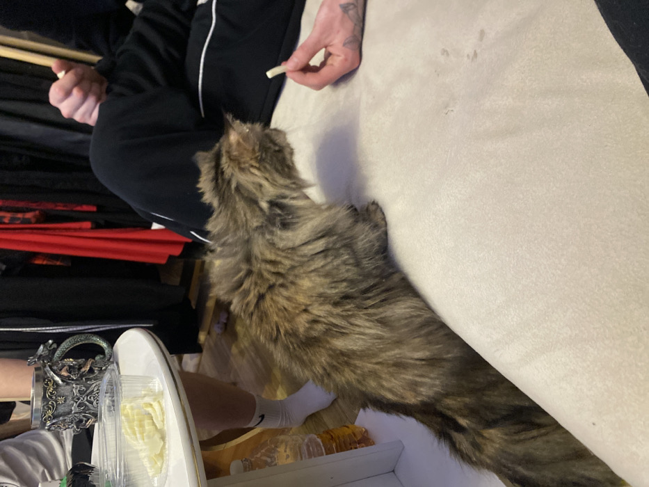 The image depicts an indoor scene in the city of Saratov, Russia, featuring a domestic long-haired cat interacting with a human. The cat, exhibiting a brown, black, and tan tabby coat, is positioned on a light-colored upholstered surface, facing right, with its gaze directed towards a small, light-colored food item (possibly a fry) held by a human hand. This hand, belonging to an individual whose left leg is visible in black track pants with a white stripe, displays faded tattooing on its dorsal surface. This same individual's other hand, also holding a similar food item, is visible near their knee. To the left, a portion of a round white low table with gold trim is visible. On this table, a decorative silver-colored mug adorned with dragon motifs and a clear plastic container holding multiple light-colored, wavy food items are present. Beneath the table, a lower leg and foot, clad in a white sock with a black Nike swoosh, are visible, along with a plastic bottle containing amber liquid on the floor. The background consists of a dark garment rack laden with various articles of clothing, including a prominent piece of red fabric.