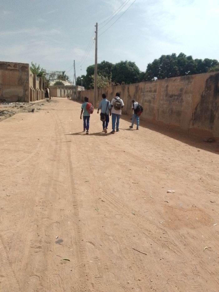 Four individuals are depicted walking away from the camera along a reddish-brown, unpaved dirt road under a bright, partly cloudy sky. The exact location within the city of Muhammadu Dikko Stadium, Nigeria, cannot be determined from the image, but the environment suggests a residential or semi-urban area. The road, which constitutes the foreground and midground, exhibits numerous tire tracks and footprints. On the left side of the road, a series of low, weathered light-brown walls and dilapidated structures are visible, with green foliage beyond them. A small accumulation of debris is present on the ground adjacent to the leftmost wall. On the right side of the road, a continuous, high, light-brown wall with visible stains and faint, indecipherable markings runs parallel to the path. A dense canopy of green trees is visible above and behind this wall. A wooden utility pole with overhead power lines stands vertically along the right side of the road, receding into the background. The four individuals, appearing to be males, are positioned in the midground, walking in a staggered formation away from the viewer. From left to right: 1. The first individual wears a light blue shirt, dark blue trousers, and a red backpack. 2. The second wears a light blue shirt, dark trousers, and a dark shoulder bag. 3. The third wears a light-colored t-shirt, blue jeans, and a light-colored backpack. 4. The fourth wears a white t-shirt, dark trousers, and a red backpack. All individuals are carrying bags or backpacks. Their shadows are cast distinctly onto the dirt road, indicating strong overhead sunlight. In the far background, further down the road, additional faint structures and figures are discernible. The overall scene suggests a dry climate.