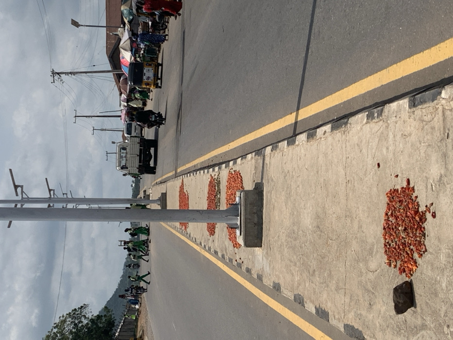 The image depicts a paved road in Adankolo, Nigeria, under an overcast sky. The road features two distinct lanes separated by a concrete median. This median contains several tall, light-colored street lamp poles, each fitted with a solar panel and an LED light fixture. Multiple small, irregular piles of reddish-orange produce, resembling peppers or tomatoes, are spread across the median, particularly around the bases of the lamp poles, with one prominent pile next to a dark rock in the foreground. On the left side of the road, a group of approximately ten individuals, several dressed in green uniforms, are observed crossing the asphalt. Beyond them, a fence line runs parallel to the road, with a distant, vegetated hill or mountain visible against the skyline. The right side of the road is marked by a bustling market environment. Numerous individuals are present, some walking, others near various market stalls covered by colorful umbrellas and awnings. Utility poles with an extensive network of overhead wires line this side. Vehicular traffic includes a white flatbed truck and a motorcycle traveling away from the camera in the right lane, followed by a yellow motorized tricycle (Keke Napep) moving towards the market area.