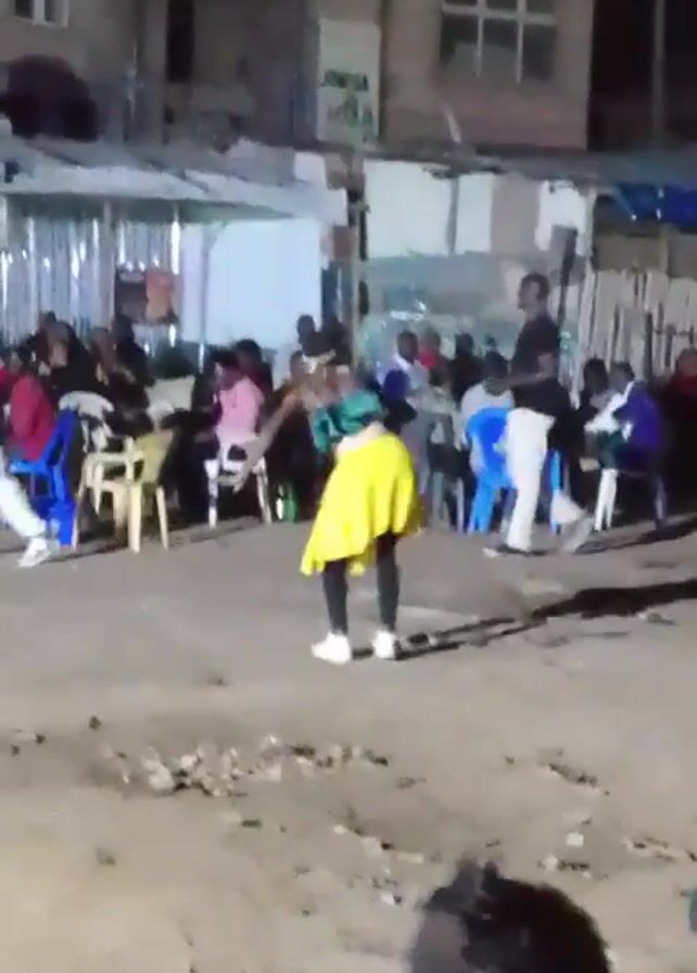 person dancing in the middle of an outdoor gathering at night. The dancer is wearing a green and patterned top, a yellow skirt, black leggings, and white sneakers. They are dancing in front of a crowd of people seated at tables and chairs, with buildings visible in the background. The ground is uneven and appears to be dirt or gravel. Some people are walking past the dancer. The overall atmosphere seems festive.