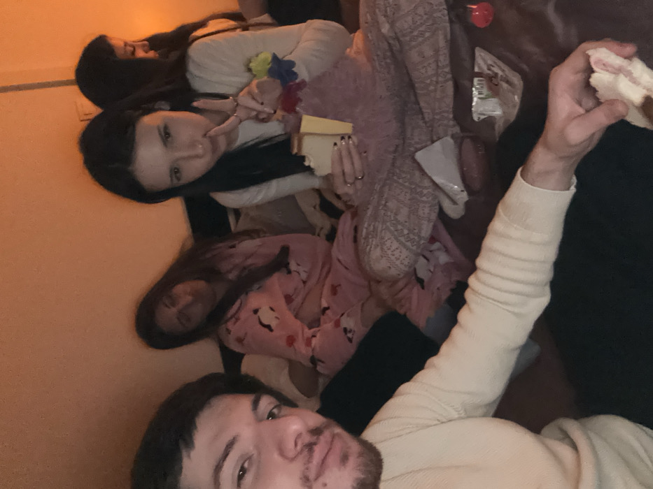 Four people are visible in the image. At the top are two dark-haired women, one laying down. Below is another dark-haired woman. All are in casual clothing. A man appears at the bottom. He has short dark hair and a beard. His arm is outstretched and holding a sandwich. There are snacks, food wrappers, and drinks on the surface they are on. The lighting is warm.