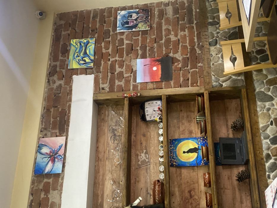 This image depicts the interior of a commercial establishment, likely a restaurant or cafe, located in the city of Kopilovtsi, Bulgaria. The primary visual is a section of a wall composed of exposed red brickwork, with a lower portion featuring a decorative arrangement of various-sized river stones embedded in mortar. The upper wall section and ceiling are painted a light yellow or cream color, with a white security camera mounted in the upper right corner. A rustic wooden shelving unit, comprising three visible shelves, occupies the left side of the frame. Above this unit, a white horizontal beam or panel is affixed to the brick wall. **Objects and Decor:** - **On the brick wall:** Five framed or canvas paintings are mounted. From top left, a butterfly with blue and pink wings; top right, an abstract design in blue and yellow; middle right, a sunset scene with a large orange sun over a dark landscape; and bottom right, a depiction of two wine glasses with grapes. - **On the wooden shelving unit:** - **Top shelf:** Contains several clear glass decorative items, possibly small pitchers. A faint, light-colored drawing resembling a Jolly Roger (skull and crossbones) is present on the wooden back panel. - **Middle shelf:** Displays a brown ceramic bowl on the left, a row of approximately twelve small white circular items (possibly decorative plates or coasters) in the center, and a black alarm clock with white numbering on the right, accompanied by small decorative figurines. A string of colorful decorative items hangs vertically from the right wooden upright of the shelf unit. - **Bottom shelf:** Features two brown ceramic bowls on the left, a vertical painting of a black cat silhouette against a large yellow full moon with blue and gold accents in the center, and several striped ceramic bowls on the right. An older model black laptop computer, open, is positioned below this shelf, flanked by two large pine cones. - **Floor/Lower Wall:** The transition from the stone wall section to what appears to be a floor or another wall type is not fully visible, but the lower edge of the frame shows a light-colored surface. - **Furniture:** In the lower right, two light-colored wooden chairs with dark seat cushions are partially visible, positioned next to a light-colored wooden table. The chair backrests feature a distinctive cut-out design. No individuals, actions, or direct interactions are visible within the frame. The scene is static and well-lit by unseen sources, with light reflecting off the upper wall and ceiling.