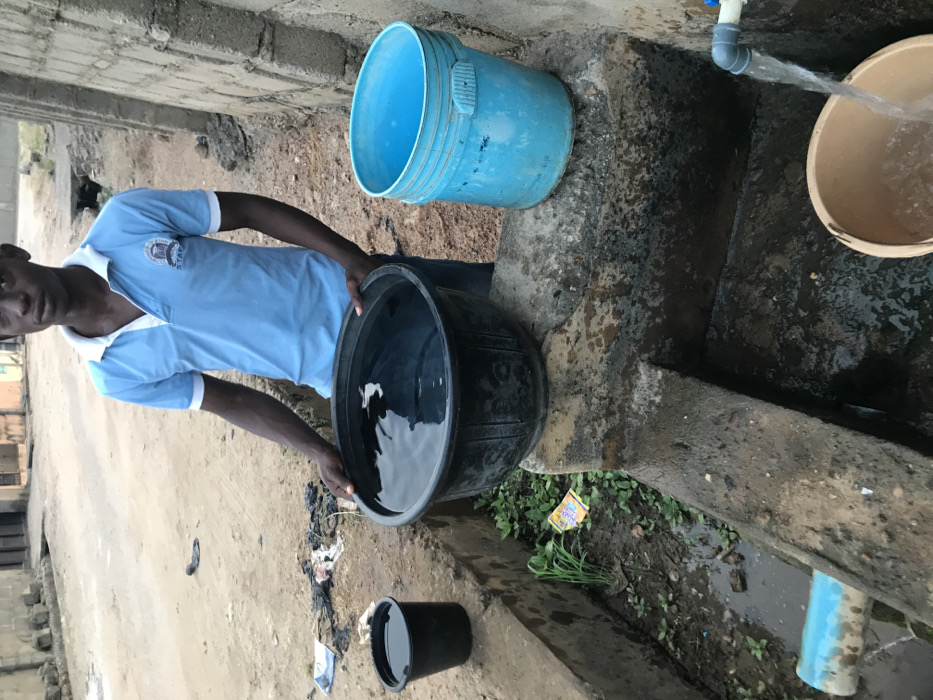 A man in a light blue shirt fills a large black plastic container with water from a tap. Another empty light blue container rests nearby. A smaller black container also appears to hold water. The setting seems to be an outdoor area with concrete structures and vegetation. Evidence of trash is seen strewn on the ground.