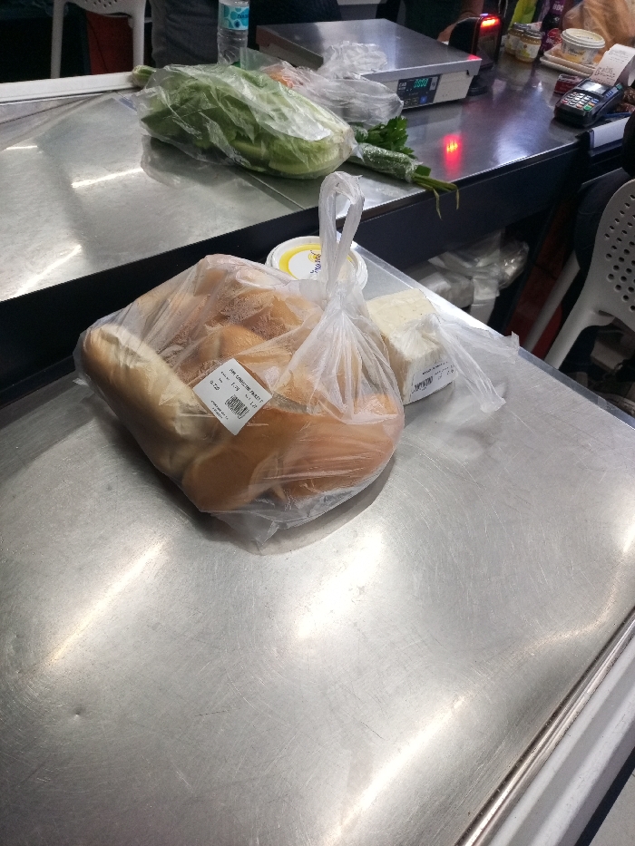 close-up, high-angle view of a grocery store or supermarket checkout counter in Unknown, Unknown. The scene features multiple food items placed on a brushed stainless steel counter, suggesting a transaction in progress. In the foreground, a clear plastic bag contains several bread rolls and a larger loaf of light brown bread. A white label affixed to the bag displays text including "PAN CORTEZ...", "1.70", "Lbs", and "1.77". To the right of the bread, a white plastic tub with a yellow lid (likely butter or margarine) and a rectangular block of white cheese wrapped in clear plastic are visible. Further back, on a raised, dark grey counter section, additional items are present. These include a large head of green lettuce in a clear plastic bag, a bundle of green onions or herbs, and a clear plastic water bottle. A digital weighing scale with a silver platform and a red digital display (partially showing numbers) is positioned on this raised section. Adjacent to the scale, a dark point-of-sale (POS) terminal with a red display and a keypad is visible, alongside a small stack of white papers. Two individuals are partially depicted in the background. One person, wearing a grey shirt, is positioned behind the counter near the weighing scale. Another person's arm is visible on the far right, adjacent to a white plastic chair with a perforated backrest. The environment indicates a retail setting where purchases are processed.