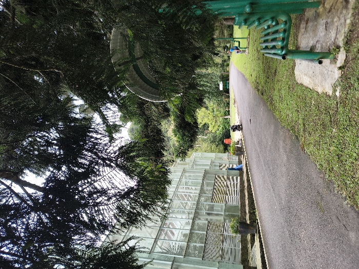 A pathway curves through a park landscape. A glass structure lines the left of the path, partially obscured by dense foliage. A large, circular structure with a green band hangs amidst the trees above. Along the right of the path, green exercise equipment sits on a concrete slab, next to a grassy area. Two people are further down the path.