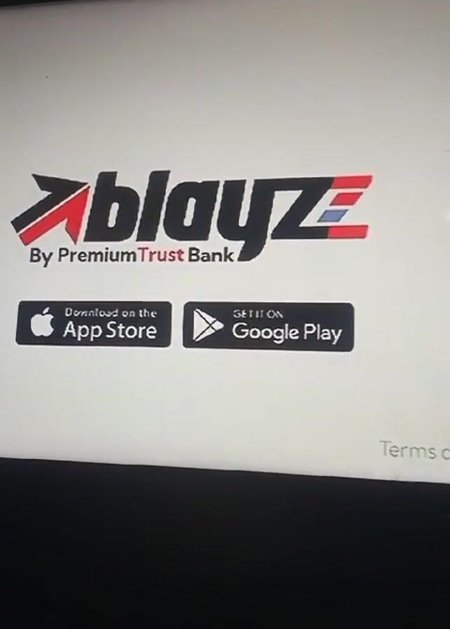close-up of a television screen displaying the logos for Blayz by Premium Trust Bank, followed by the Premium Trust Bank logo. The screen also shows icons for downloading the Blayz app from the Apple App Store and Google Play. Text on the screen states "Nigeria's fastest growing bank". The camera is stable. The video appears to be taken indoors, as indicated by the reflections on the screen. The background is dark.