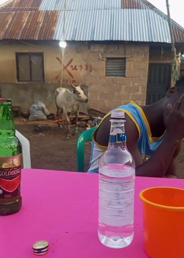 person in a blue and yellow tank top sitting at a pink table with their head in their hands. On the table, there is a bottle of water and an orange bucket. A bottle of Goldberg beer is also placed on the table. A white cow stands in the background, near a building with a corrugated metal roof. The scene then shifts to a second person in a blue shirt sitting at the table and looking towards the first person. There are several green and white plastic chairs in the background. The setting appears to be a rural or village environment.