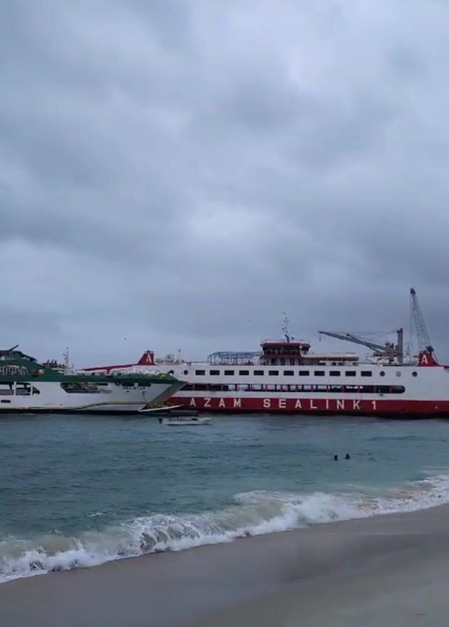 two large ships docked near a sandy beach under a cloudy sky. The ship on the right is red and white with the name "AZAM SEALINK 1" painted on its side. The other ship is white with green accents and is labeled "Zan Fast Ferries." There is a small boat between the two ships. People can be seen swimming in the water near the beach. The waves are gentle as they meet the shore. The sky is overcast, suggesting a gray or potentially rainy day.