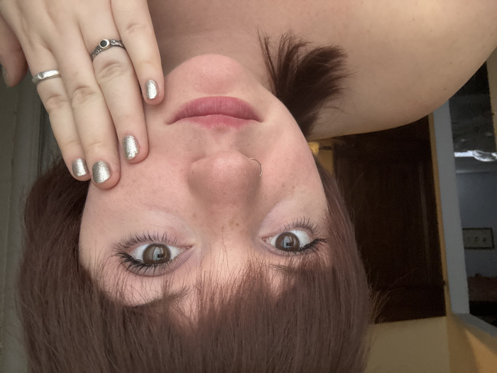 An indoor, eye-level photograph depicts a fair-skinned individual with short, dark reddish-brown hair cut with bangs, directly facing the camera. The individual has brown eyes with visible eyelashes, light pink eyeshadow, a gold nose ring in the left nostril, and light pink lips, with freckles visible on the cheeks. The left bare shoulder is partially exposed. The individual's left hand is positioned with fingers resting against the left cheek. The fingernails are covered in silver glitter polish. A plain silver-toned band adorns the left ring finger, and a textured silver-toned ring with a black circular stone is on the left middle finger. The background is out of focus, showing a dark brown door or wall to the right, and a partially obscured doorway leading into another dimly lit room on the left. Within the distant room, indistinct furniture, possibly a bed, and a framed object on a wall are visible. The setting is an interior space in Montepulciano, Italy.