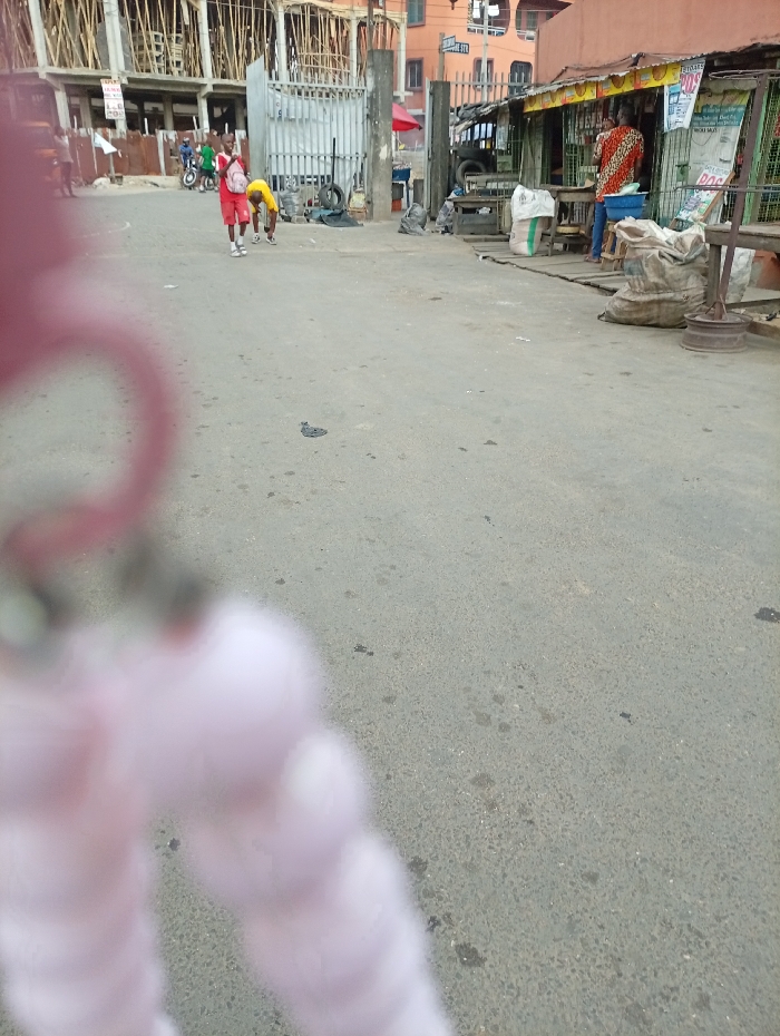 The image presents a daytime street scene on Adeniran Ogunsanya Street in Surulere, Lagos, Nigeria. The lower-left foreground is obscured by a blurry, light pink, braided object. The midground features a grey asphalt road with visible stains and minor debris. On the left side of the road, two males are visible: one wearing a red short-sleeved top and red shorts, standing upright with a light-colored item on his back; the other, in a yellow top and dark bottoms, is bent forward at the waist, seemingly interacting with the ground. Further back on the left, a person on a motorcycle is present. The background on the left features a multi-story building under construction, characterized by exposed concrete framework and extensive wooden scaffolding. A large metal gate stands in front of this area. On the right, a row of single-story market stalls with corrugated roofs and reddish-brown facades lines the street. A person wearing a patterned orange, black, and white top with blue trousers stands near these stalls. The stalls display various goods, large sacks, and signage, including a "POS" (Point of Sale) sign and other illegible text. Visible objects include a blue plastic basin and metal weighing scales on the ground near the stalls. In the far background, behind the market stalls, a multi-story building with an orange-red facade is visible.