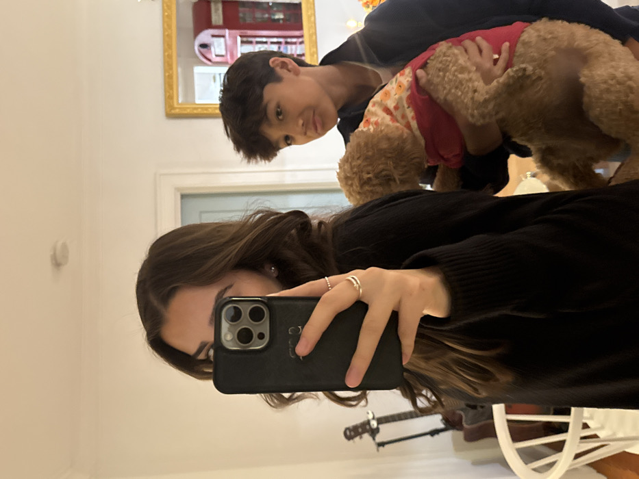A mirror selfie shows a woman in black clothing taking the photo, with an iPhone 13 Pro in her hand. Behind her, a boy in a dark blue jacket holds a brown poodle wearing a red shirt with a floral pattern. A gold-framed mirror hangs on the wall, reflecting a red double-decker bus souvenir. A glimpse of a white wall, a coat hook, and a musical instrument on a chair are also visible. The picture is slightly rotated counter-clockwise.