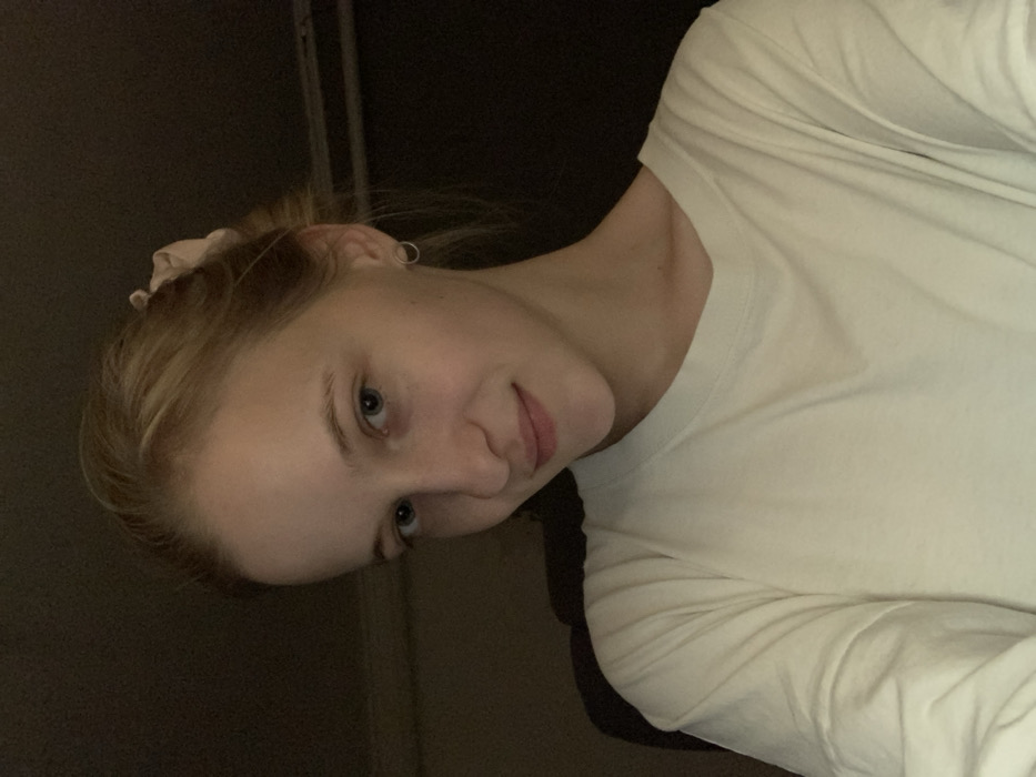 The image depicts a head and upper torso portrait of a single young fair-skinned female in an indoor setting. Her blonde or light brown hair is pulled back, secured by a light-colored scrunchie visible on the right side of her head. She has blue eyes and is looking directly at the camera with a slight, closed-lip smile. She wears a light-colored, long-sleeved t-shirt with a round neckline and small, circular hoop earrings in both ears. The background is dark and indistinct, with a shadowed, dark object, possibly part of a chair or furniture, partially visible behind her left shoulder. The lighting is low, illuminating the subject primarily from the front. The specific location within the city of Bohuslav, Ukraine, is not discernible from the visual content of the image. No other individuals or discernible objects are present, and no active interactions are depicted.