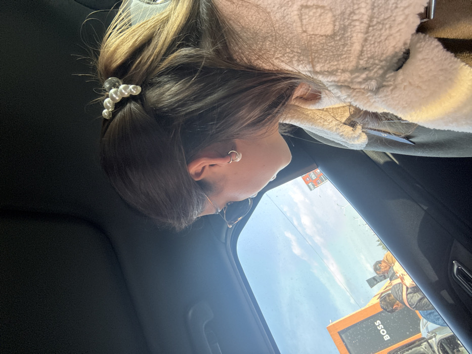 - "A woman sits in a car, hair pulled back with a pearl clip" by FM-mkaXg2, licensed under CC BY 4.0
