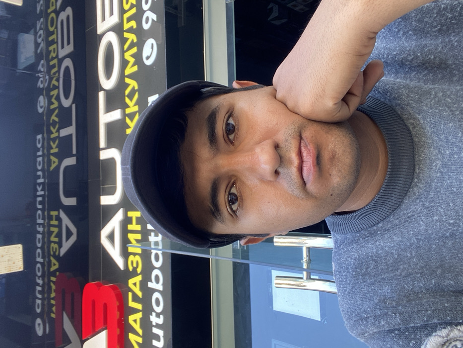 A male individual with medium complexion and dark hair, wearing a dark baseball cap and a grey long-sleeved sweater with a ribbed collar, is depicted from the chest up, looking directly into the camera. His right hand supports his jawline, and he maintains a neutral expression. He is positioned in front of a glass storefront, reflecting an illuminated black sign overhead. The sign displays white Cyrillic text, clearly reflecting "AUTOBAT" and "МАГАЗИН" (Store) in yellow, along with partial Cyrillic for "АККУМУЛЯТОРЫ" (Accumulators/Batteries) and a phone icon with a number beginning "99". A glass door with a polished metallic vertical handle is partially visible to the individual's left, behind the glass. The scene takes place at an auto parts store specializing in batteries, located in Bukhara, Uzbekistan.