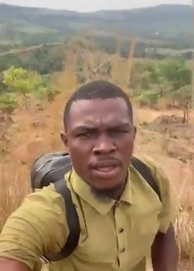 man with a backpack hiking up a steep, dry, grassy hillside. He is wearing a short-sleeved green shirt and dark-colored pants. The landscape behind him is a mix of brown, hilly terrain with some patches of green trees. The sky is overcast. The man looks directly at the camera, making faces and occasionally grimacing.