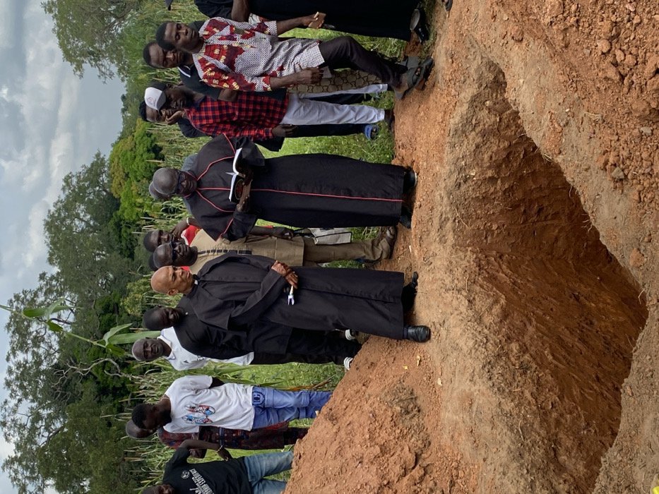 The scene depicts an outdoor gathering in Akwanga, Nigeria, centered around a freshly excavated grave