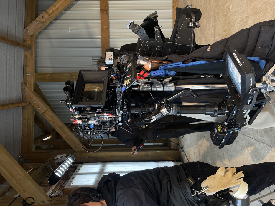 The scene depicts an indoor film or video production setup within a large structure in Pommeuse, France