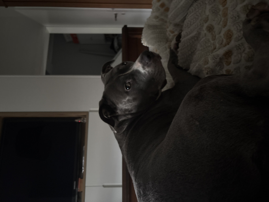 A dark grey pit bull type dog, exhibiting a stocky build and short fur with white markings on its muzzle, is depicted lying on a light-colored, textured blanket indoors. The dog's head is turned, with its gaze directed towards the camera, while its body rests on a wooden surface partially obscured by the blanket. In the upper left background, a wall-mounted black flat-screen television is visible above a white storage console, which features a small, dimly lit decorative object. To the right of the dog, a white door with a light-colored handle stands partially open, revealing a darker adjacent room. Another piece of dark wooden furniture is present near the doorway. The room's walls are light-colored. This scene is located within a residence in the city of Esch-sur-Alzette, Luxembourg.