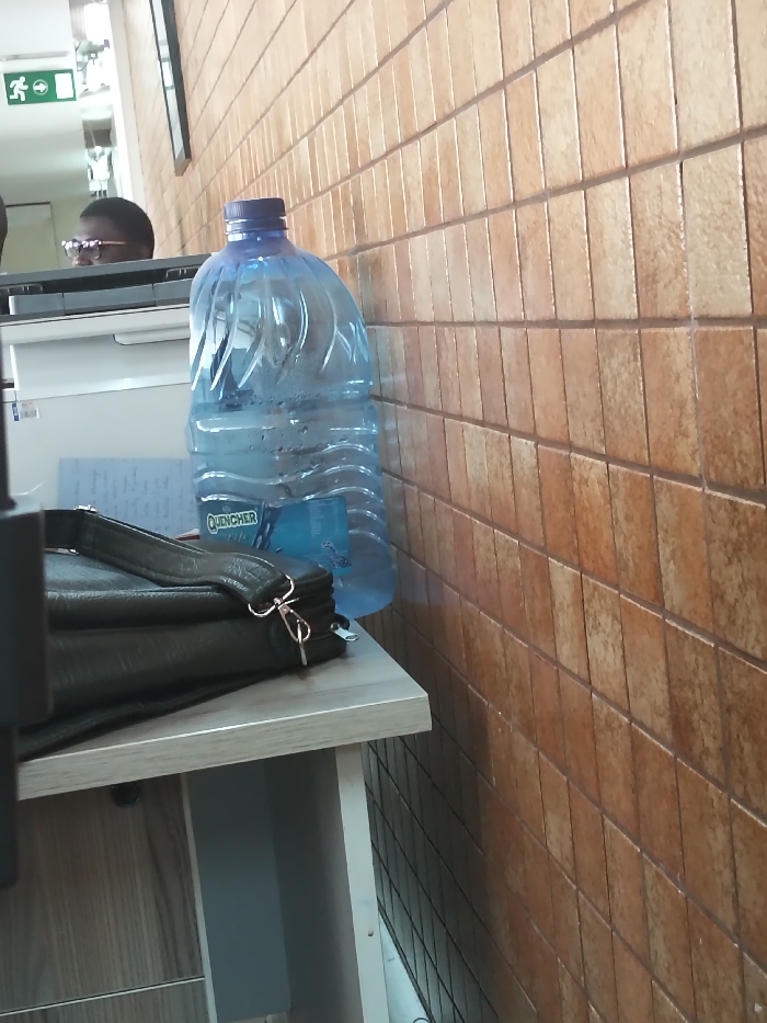 The image displays an indoor scene within Viwandani ward, Kenya, featuring a beige tiled wall on the right and an office-like setting on the left. In the foreground, a large, clear plastic "QUENCHER" water bottle with a blue cap and condensation is positioned on a light-colored desk surface. To its left, a black synthetic leather shoulder bag with a silver clasp rests on the same surface, partially obscuring a stack of papers with blue markings. Behind these items, a white office machine, possibly a printer or copier, is visible. Above and behind the office machine, the upper part of an individual's head, appearing to be of dark complexion and wearing glasses, is present. In the upper-left background, a green exit sign with a white running man pictogram and a right-pointing arrow is visible, reflected in a surface that also shows a black framed object.