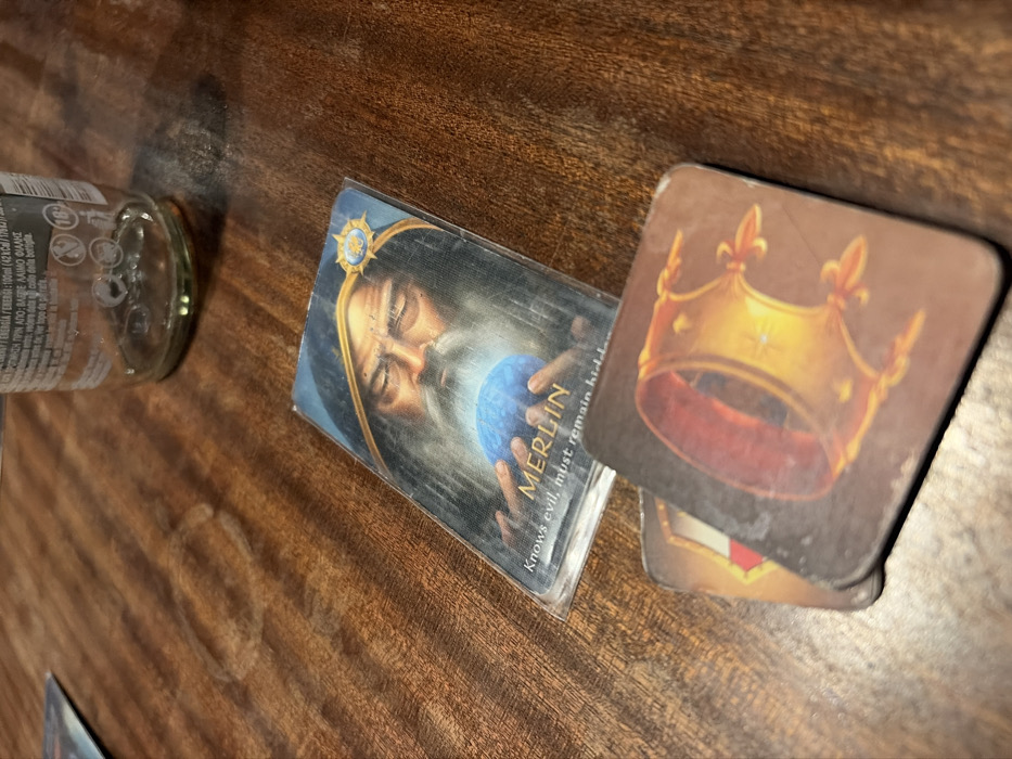 This image captures a tabletop scene in an indoor setting in Sofia, Bulgaria, featuring game components and a beverage container resting on a dark brown wooden surface. In the mid-ground, a rectangular card, protected by a transparent sleeve, displays an illustration of an elderly, bearded man resembling Merlin, holding a glowing blue orb. The text "MERLIN" and "Knows evil, must remain hidden" are visible below the illustration. Below and slightly to the right of this card, a stack of at least two square game tokens or coasters is visible. The top token features an illustration of a golden crown. In the upper right quadrant of the image, an empty, clear glass bottle with a small amount of liquid residue is present. Partial text in Cyrillic script, including "ЕНЕРГИЯ," "100ml," and "42 Kcal," along with an "18+" age restriction symbol, is discernible on the bottle's label. The items are situated on a wooden table exhibiting a dark grain pattern and several faint, dried ring marks, consistent with spilled liquids or condensation from beverages. No human subjects are directly visible. The scene is illuminated by an unseen light source, casting subtle reflections on the bottle and card sleeves.