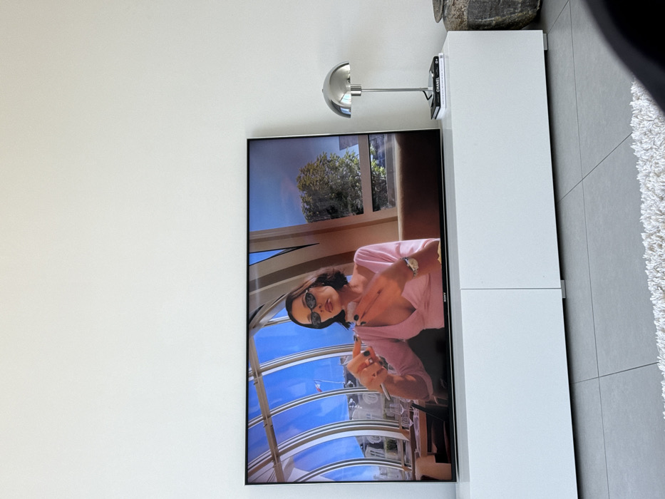 The image displays an indoor room located in Tielrode, Belgium. A large, black-framed Sony flat-screen television rests on a white, two-door media console. The television screen presents a still image of a female individual. This individual possesses dark hair, wears dark sunglasses, a light pink v-neck top, and dark nail polish. She holds a thin, dark object in her right hand, pointed upwards, while her left hand is open, fingers slightly spread, displaying a silver watch on her wrist. The scene depicted on the television is an upscale restaurant or cafe with large, arched glass windows revealing a clear blue sky, a white architectural building, and a French flag on an exterior pole. Green foliage is also visible outside the windows. To the right of the television, a chrome-finished table lamp with a domed shade stands on the console. Below the lamp, two books are stacked; the uppermost book is labeled "CHANEL." A dark, textured pot or vase is partially visible on the far right. The room features white walls and light grey square floor tiles. A portion of a white shag rug is visible in the bottom foreground.
