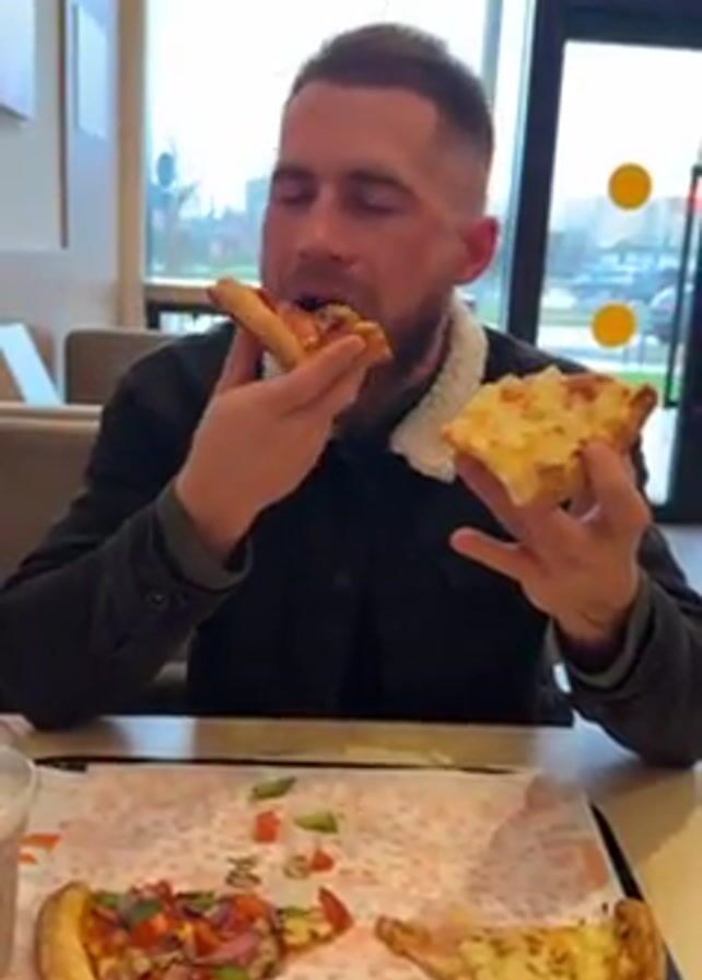 A man with a beard is sitting at a table, eating two different slices of pizza at the same time. He is holding one slice in each hand, alternating bites. The pizza on the left has red sauce, pepperoni, green peppers, and red onions. The pizza on the right is yellow and appears to have pineapple. Two additional slices of the same pizzas are on the table in front of him. He is wearing a dark jacket with a light-colored sherpa collar. A plastic cup is also on the table. He is sitting inside a restaurant with large windows.