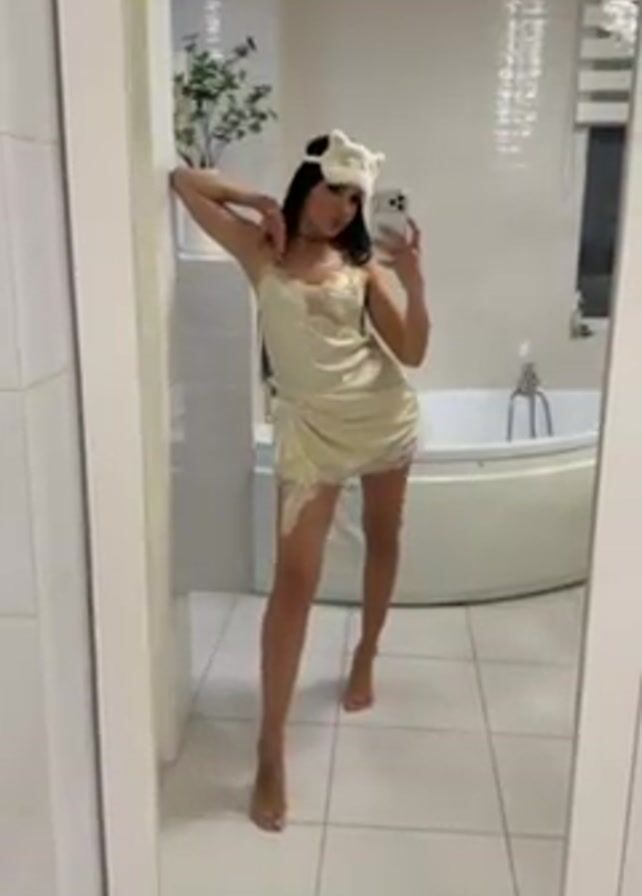 A woman is taking a selfie in a bathroom. The bathroom is tiled white and contains a jacuzzi bathtub. She's wearing a satin nightgown with lace trim and a sleep mask with bear ears. She leans against the wall and waves.