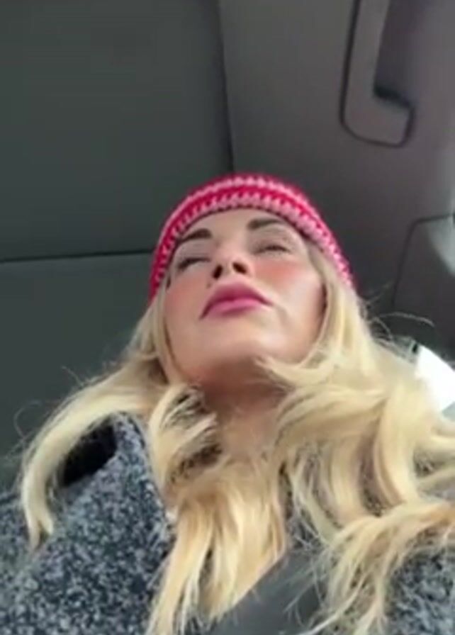 A fair-skinned woman with long blonde hair is inside a car, facing upwards. She is wearing a pink knit cap and a gray coat, and her seatbelt is fastened. The car's interior, including the sunroof, is visible. Music is playing in the background.