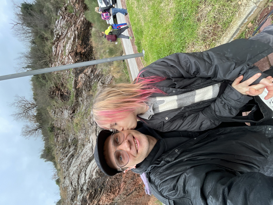 A man wearing glasses and a cap poses for a selfie with a young girl with blonde hair and pink highlights, who is kissing his forehead. They are dressed in dark jackets. Behind them is a rocky hillside, a road with people walking, and a green grassy area. The photo is taken at an angle, with the sky appearing overcast. They are holding hands.