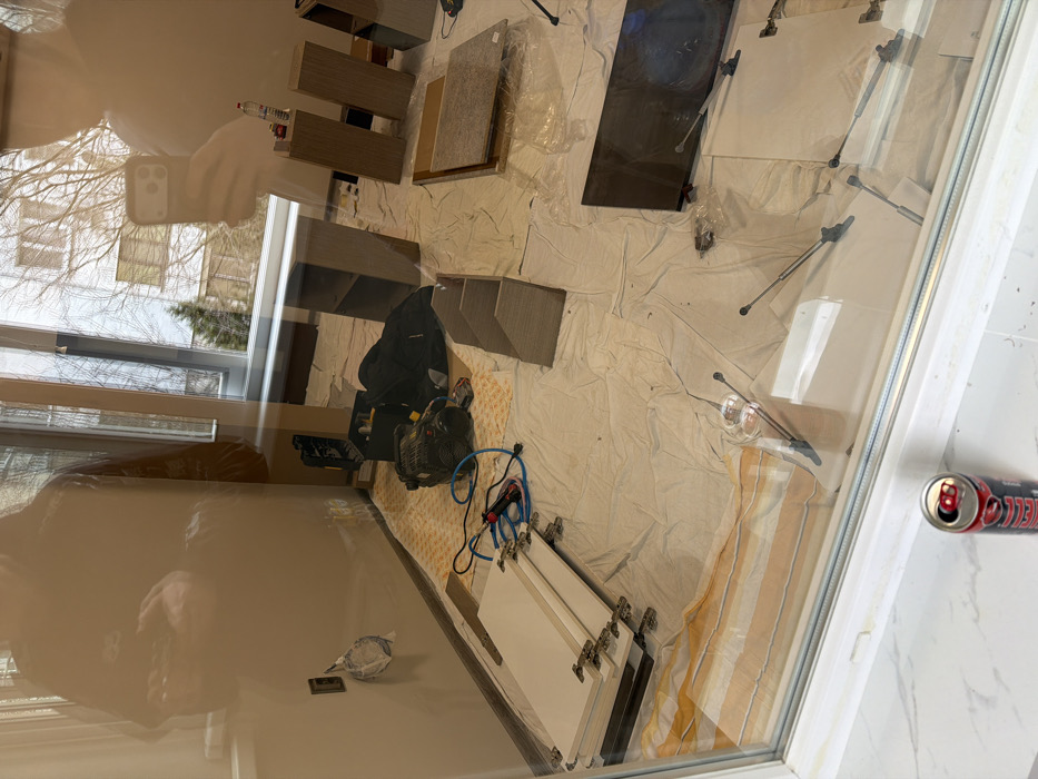 An interior room undergoing renovation or furniture assembly is viewed through a reflective glass panel