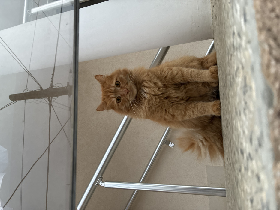 - "An orange, medium to long-haired cat is observed sitting upright on a light-colored, mottled grey and brown tiled surface, positioned in what appears to be an exterior or semi-enclosed stairwell or landing area in the city of Berkovitsa, Bulgaria" by FM-l7fR82, licensed under CC BY 4.0