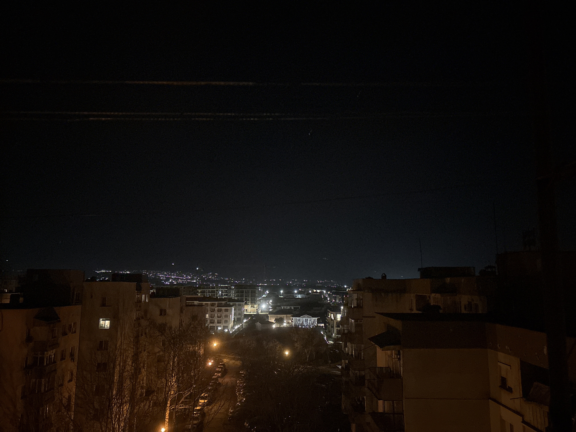 The image displays a nighttime panoramic view of a residential district in Plovdiv, Bulgaria, captured from an elevated vantage point. Multi-story buildings, primarily apartments with muted facades, populate the foreground and midground. Scattered windows across these structures are illuminated, indicating interior light sources. A specific window in a prominent midground building is brightly lit, revealing two indistinct forms within. Streets are visible between buildings, lined with parked vehicles, and illuminated by orange-yellow streetlights. Deciduous trees, currently lacking foliage, are interspersed throughout the urban landscape. The background extends into the distant city, characterized by numerous small points of artificial light. The horizon is defined by the dark, irregular silhouette of hills or mountains, which also bear scattered lights, against a dark and clear night sky.
