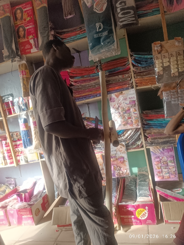 The scene depicts the interior of a retail shop located in Sabon Gari East, Nigeria, as photographed on 09/01/2026 at 16:26